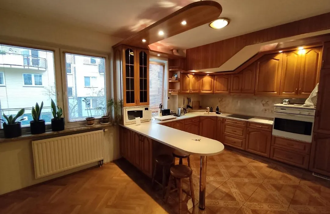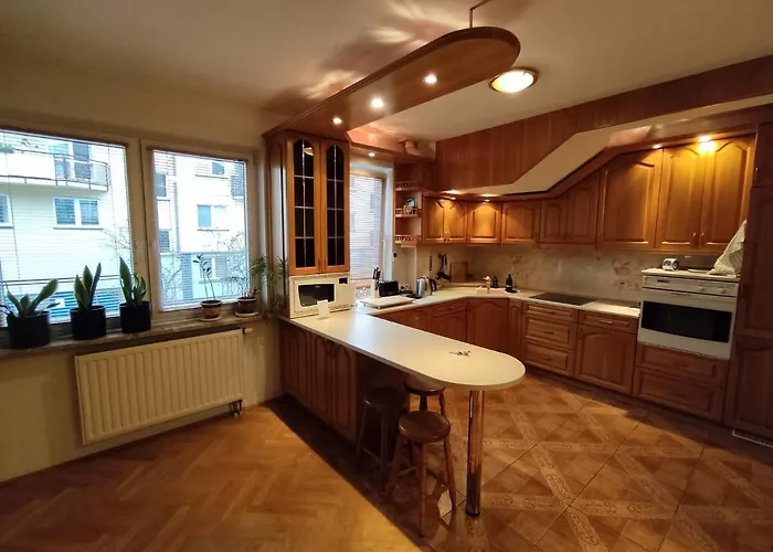 Die voll ausgestattete Küchenzeile ist in der Unterkunft ebenso vorhanden wie ein Herd und ein Geschirrspüler darauf. Die Unterkünfte ist gleich neben der nächstgelegenen Bushaltestelle Lokajskiego 01.